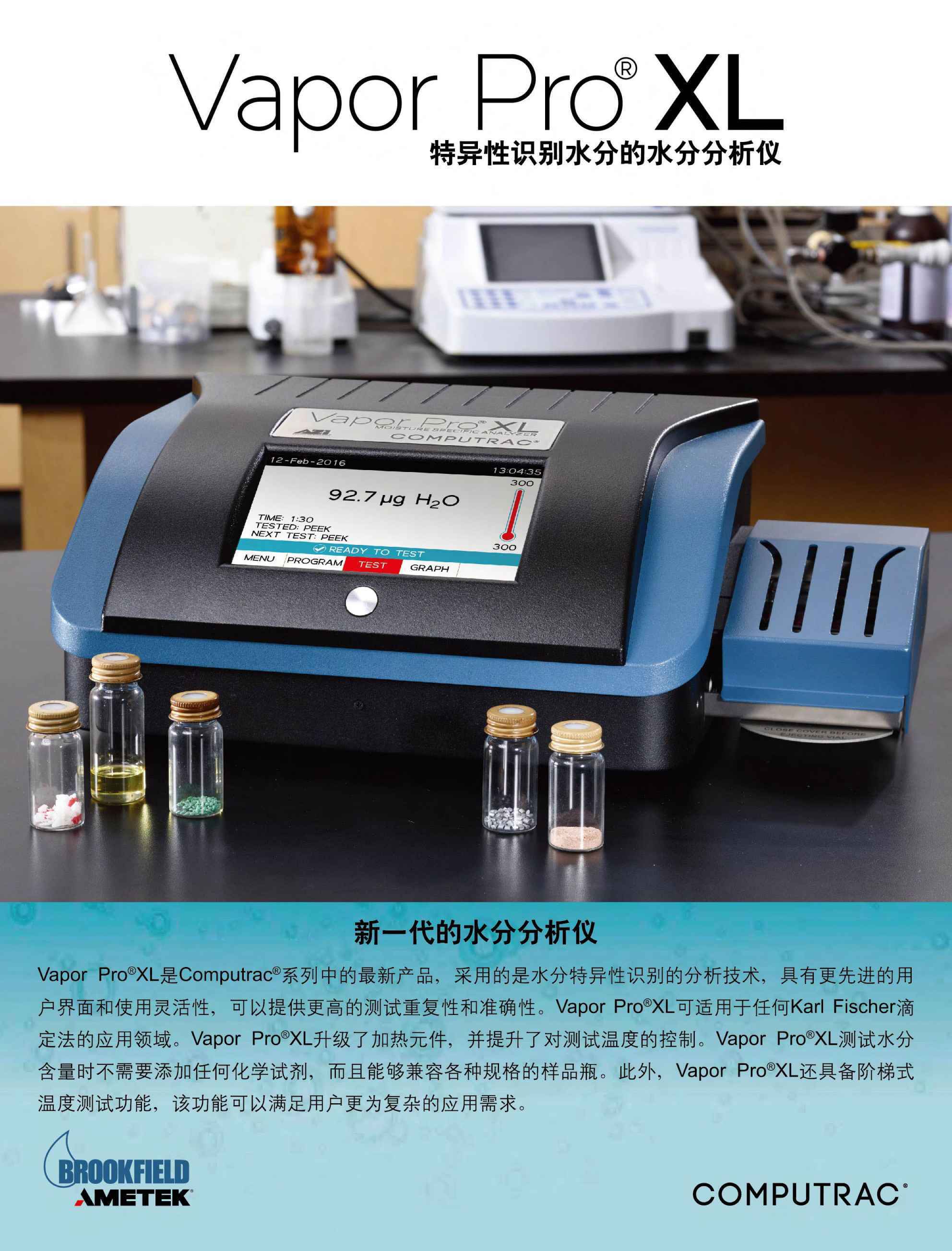 高度的可重復(fù)性、精確度、靈活性和先進(jìn)的用戶界面 – Vapor Pro XL水分儀采用了Computrac系列中的水分特異性分析技術(shù)。VPXL可適用于任何卡爾費(fèi)休滴定法的應(yīng)用領(lǐng)域。VPXL升級(jí)了加熱元件,并提升了對(duì)測(cè)試溫度的控制。VPXL還可以和多種尺寸的樣品瓶兼容,并配備了階梯式溫度測(cè)試功能,以增強(qiáng)方法開發(fā)功能。